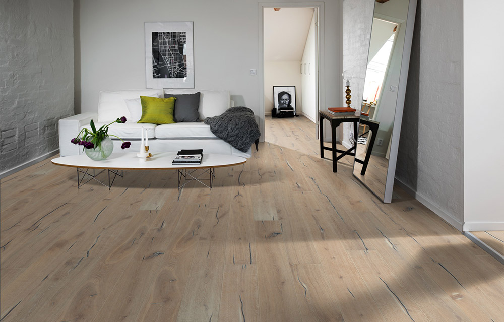Состаренный дуб в светлых тонах хлеба и муки. Аспеланд – изысканная доска в деревенском стиле с трещинами и сучками, которые придают ей потертый отреставрированный вид.
