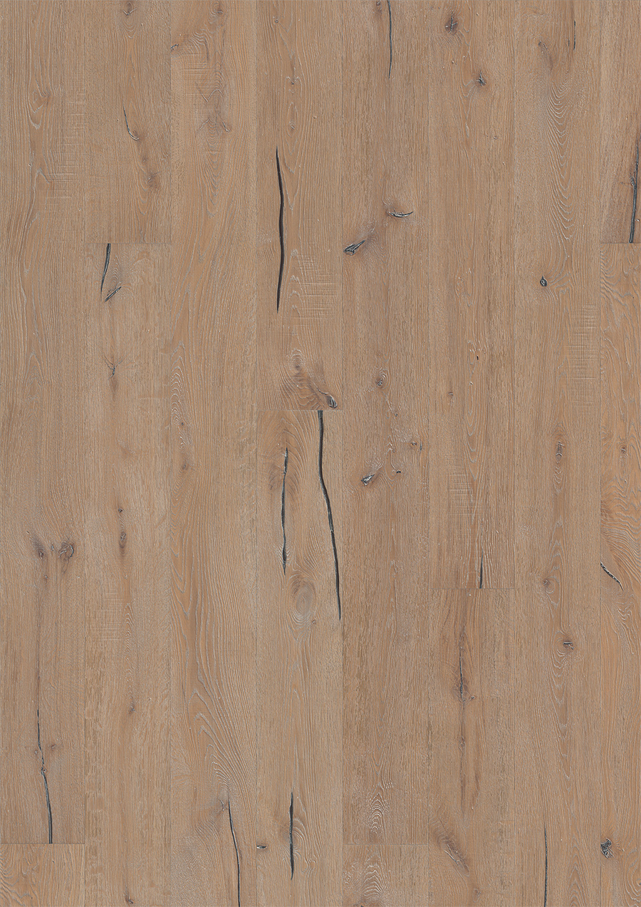 Состаренный дуб в землисто-серых тонах. Глубоко брашированная доска с ярко выраженными сучками и трещинами.