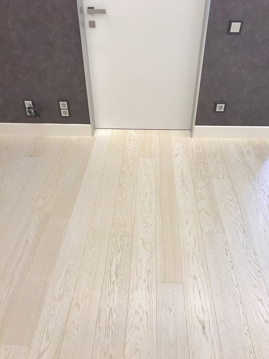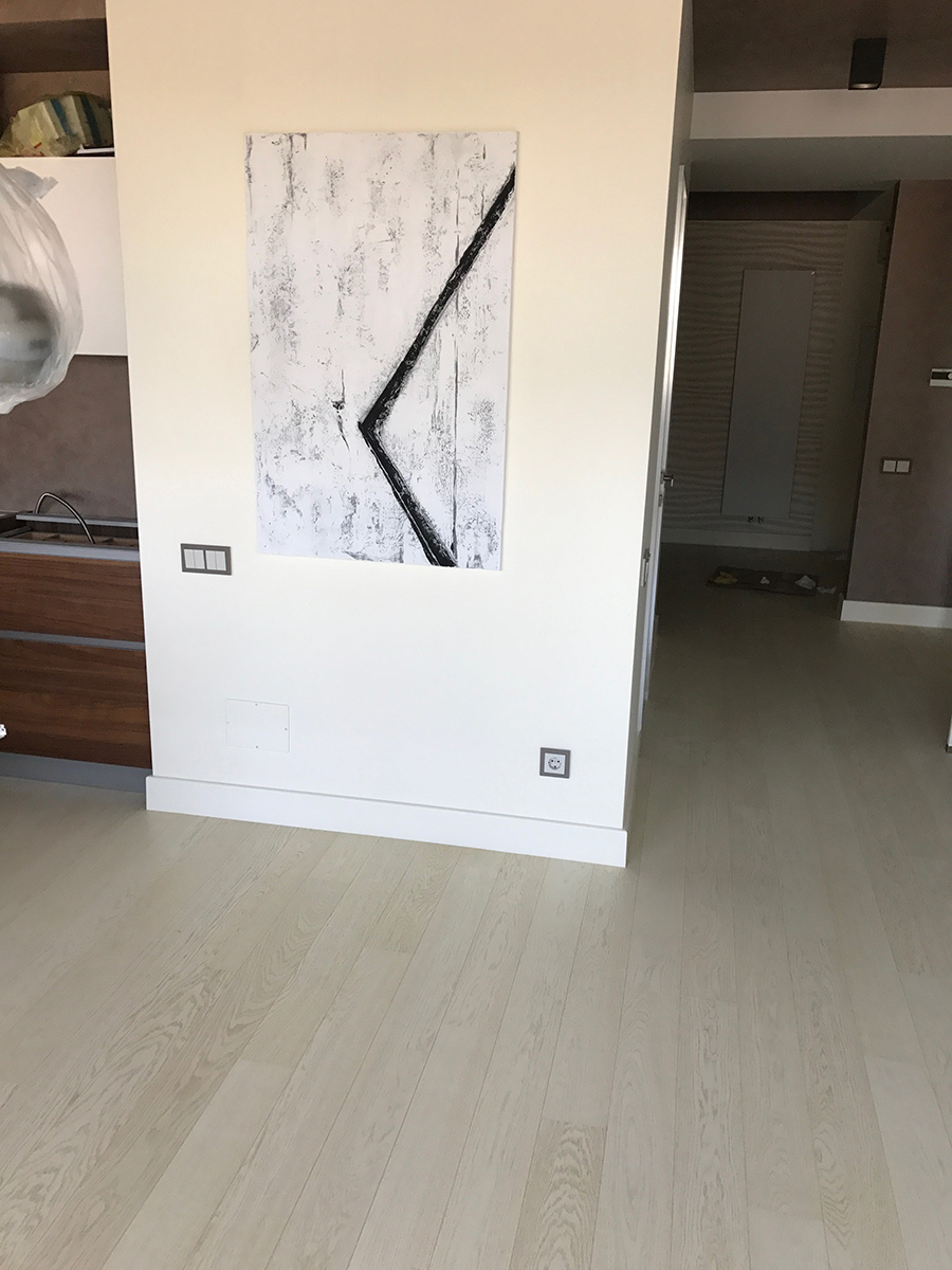Parchetul 1-strip de culoare deschisă conferă interiorului acuratețe și simplitate. În urma prelucrării lemnului cu peria și uleiul colorat (tehnologia “Stonewashed”), suprafața podelei devine netedă și luminoasă.
