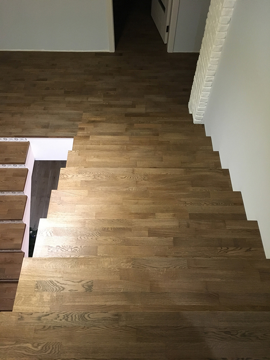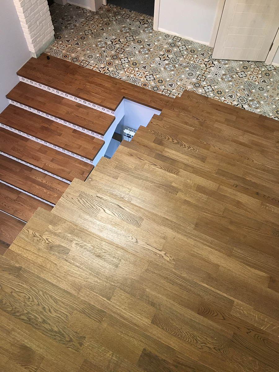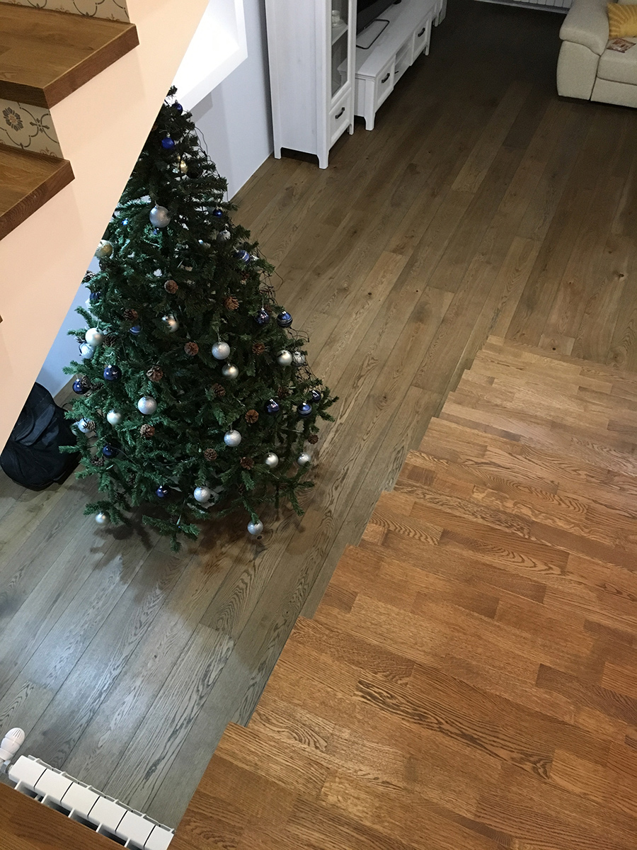 Pardosea 3-strip din stejar, șlefuită cu peria, prelucrată cu ulei cafeniu. Se permite: varierea culorilor, alburn, benzi întunecate, rază medulară, rar – noduri concrescute și noduri căzătoare prelucrate.